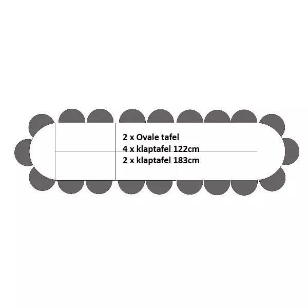 De ovale tafel biedt voldoende ruimte voor 20 personen en is ideaal voor evenementen, feesten of vergaderingen. De tafel is eenvoudig op te stellen, dankzij de inklapbare poten! De combinatie van enkele klaptafels en twee halfronde aanzetstukken maakt de tafels gemakkelijk te transporteren.