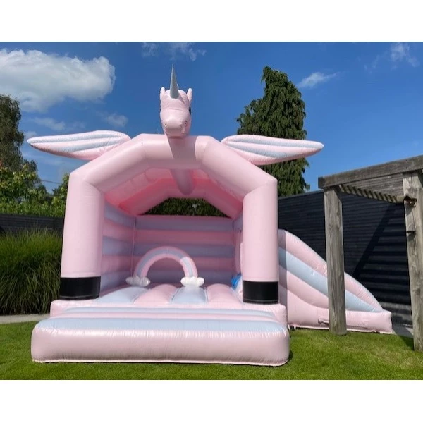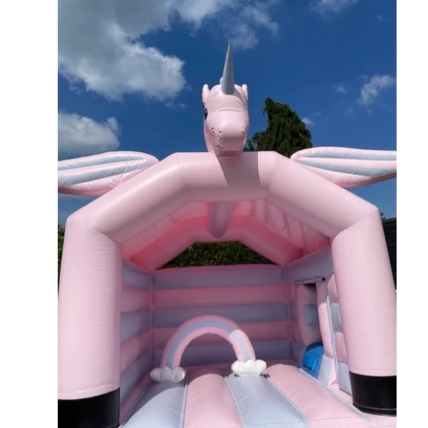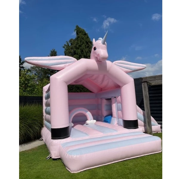 Droom jij over fabeldieren, unicorns en andere mythische werelden? Dan zal je dit pastelroze eenhoorn springkasteel vast en zeker magisch vinden! Dit opvallende magisch thema springkasteel met glijbaan is een echte eyecatcher. Een verjaardag, lentefeest of communiefeest in thema van unicorns?