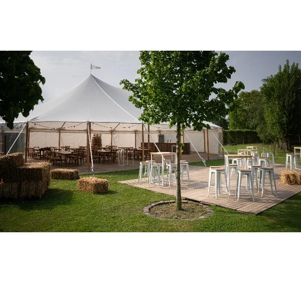 De massief houten palen, het lichtdoorlatende tentzeil en de wimpels zorgen voor een romantisch effect. Het lichte witte stof biedt voldoende bescherming tegen regen/zon en ’s avonds komt de verlichting helemaal tot z’n recht. Bovendien kan de tent afgesloten worden middels doorschijnende zijwanden.