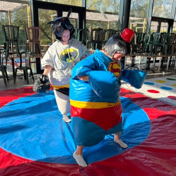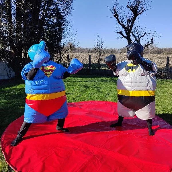 Sumoworstelpakken is een grappige en interactieve attractie, die niet al te veel plaats inneemt. Zoek een tegenstander uit en betreed samen de mat. Na het buigen is het de bedoeling dat je elkaar probeert te vloeren of probeert elkaar van de sumoworstelmat te krijgen. De hoofdbescherming, handbeschermers en zachte mat zorgen ervoor dat je dit spel veilig kan spelen. Dit spelletje zorgt ongetwijfeld voor de meest hilarische momenten op jouw feest.