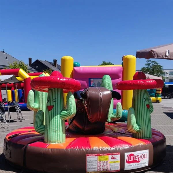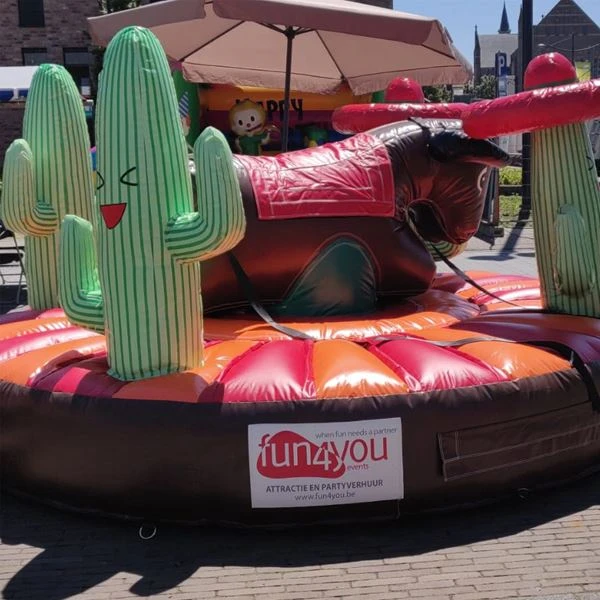 Deze attractie is altijd een voltreffer op elk evemenent of feest! Spring op de rodeo en blijf zo lang mogelijk er opzetten, de personen langs het springkasteel proberen jou zo snel mogelijk er af te krijgen door zo hard mogelijk te trekken en te bewegen aan de koorden! Word jij de echte rodeo ster die het langste kan volhouden?!